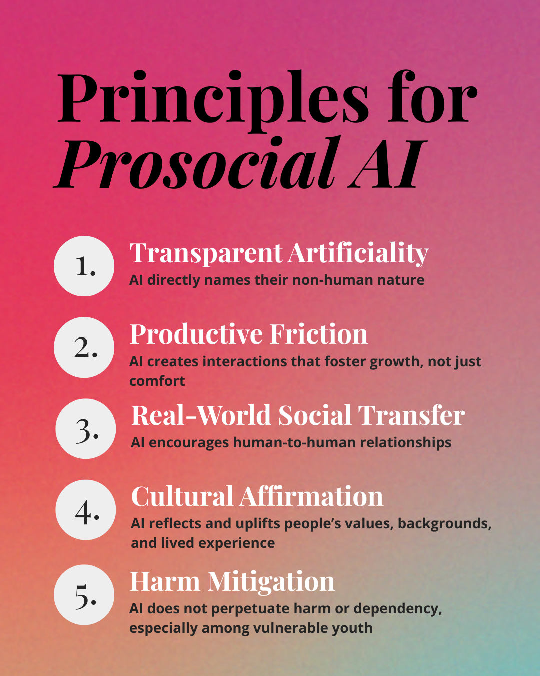 This work led to the creation of our five Pro-Social Principles, a practical framework for designing and evaluating AI that supports human-to-human relationships. Partners use these principles to audit tools, guide product design, and make more intentional choices about how AI shows up in young people’s relational lives.