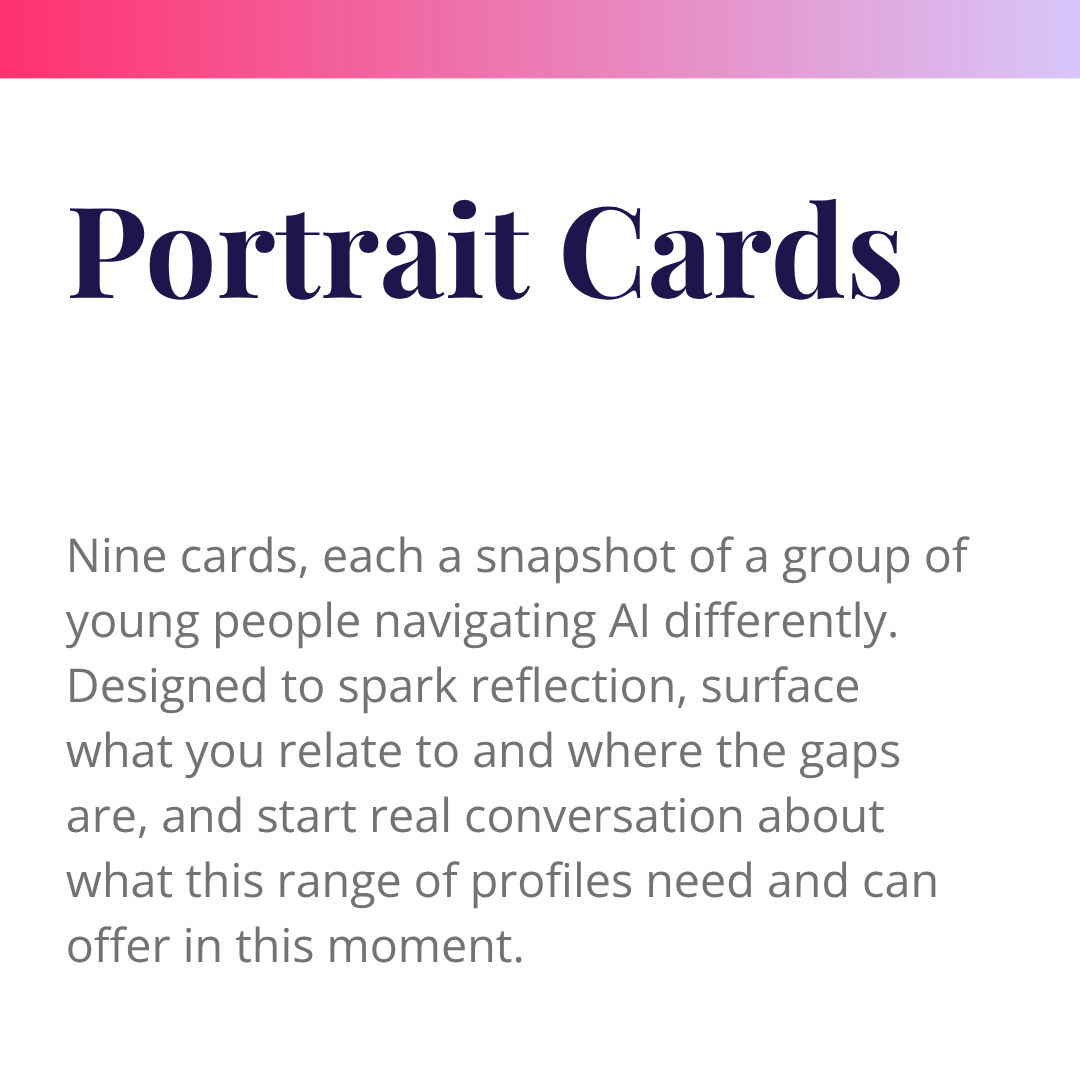 This study isn’t the final answer — it’s a launching point. Our hope is that it sparks deeper, more honest conversations about the reality of young people’s AI use, its impact on their social worlds, and what we want to do about it. To help you bring that conversation into your team, your classroom, or your dinner table, we’ve built three companion tools to get you started.